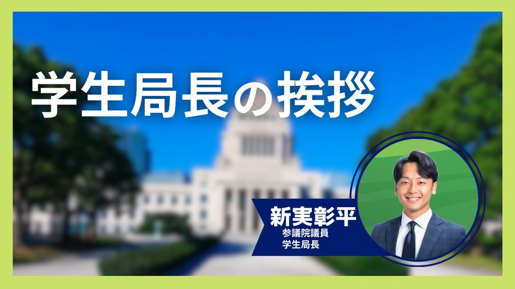 皆さん、初めまして!日本維新の会学生局長、参議院議員の新実彰平です。