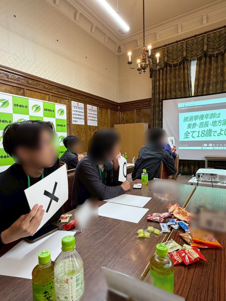 次に行われたのは、「政策〇✖︎トーク」が行われました。提示されたお題に対して〇か✖かを考え、その理由を共有するという企画です。例えば、「若者の投票率が低いのは政治家の責任か」といったテーマや、「維新はマッチョのままでよいのか」といったユニークな問いもあり、会場は大いに盛り上がりました。指名された参加者が自らの考えを自分の言葉で発表し、多様な考え方に触れることができました。
