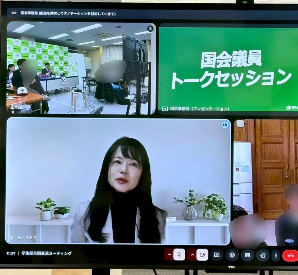 2026年2月22日、東京(衆議院控室)・大阪(党本部)・オンラインをつないで「学生部×学生局 交流会」が実施されました。当日は高校生や大学生など多くの学生部員と国会議員、地方議員の学生局員が参加しました。また、ゲストとして高木かおり参議院議員が参加されました。この記事では、私が参加した東京会場の様子を中心に、当日の様子をご紹介いたします。